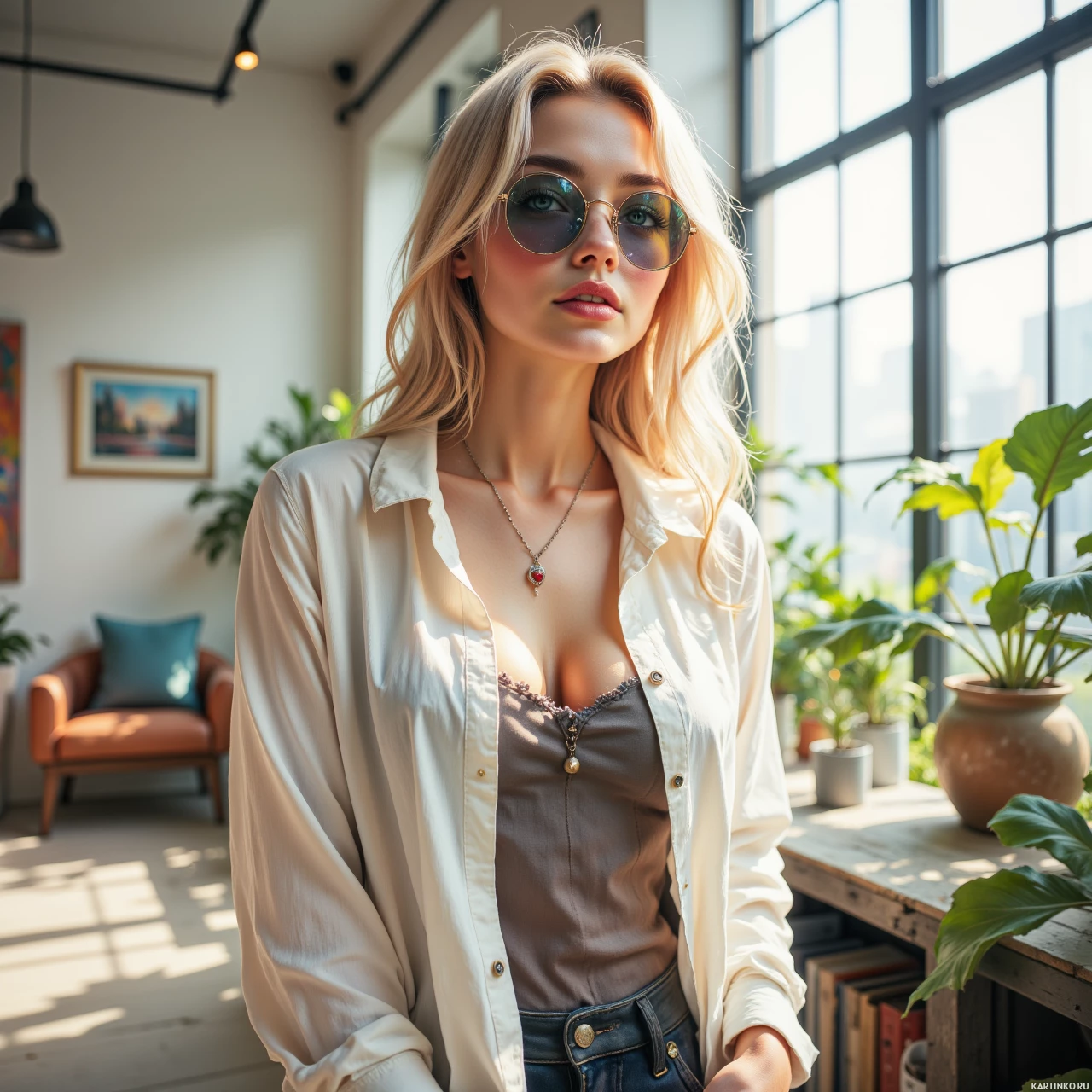 На картинке девушка с светлыми волосами стоит в помещении, похоже на современную гостиную или офис. На ней светлая рубашка и солнцезащитные очки. Справа от нее – окно, пропускающее естественный свет. На стене позади нее висят рамки с фотографиями, дополняющие интерьер. На заднем плане можно увидеть диван, частично скрытый девушкой.