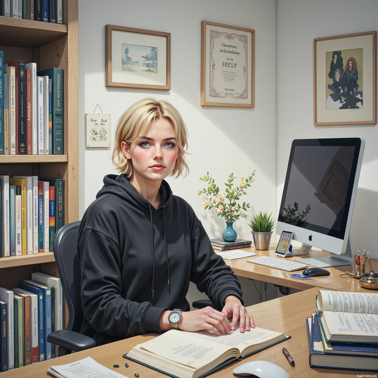 На картинке молодая женщина с светлыми волосами сидит за столом, вероятно, в офисе. На ней темный худи, руки сложены на столе. На столе лежат несколько книг и компьютерный монитор с черным экраном. На стене позади нее висят рамки с дипломами или наградами. Перед ней в горшке стоит небольшое растение, а слева горит свеча. Освещение предполагает, что это день, так как видно естественный свет из открытого окна.