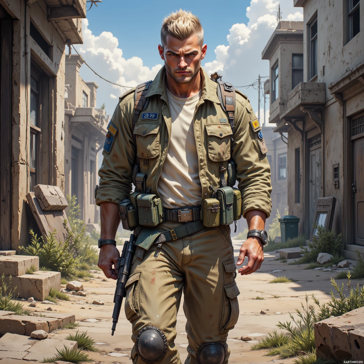 На картинке изображен мужчина с светлыми волосами в военной форме, украшенной нашивками и значками. В правой руке он держит винтовку, на нем шлем и бронежилет, что говорит о том, что он, вероятно, находится в зоне боевых действий или в тактической обстановке. На заднем плане — разрушенный городской пейзаж с обломками бетона, что создает ощущение войны или постапокалиптического мира.
