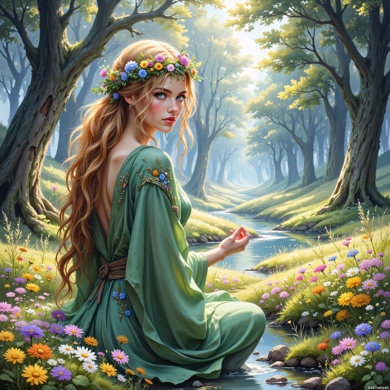 На картинке изображена девушка, сидящая на берегу реки, окруженная лесом. У нее длинные светлые волосы и одеяние, словно сошедшее со страниц сказки или мифа. Ее волосы и наряд украшены цветочными мотивами. Стиль картинки очень детализированный, как иллюстрация для обложки книги или концепт-арт для видеоигры или фэнтезийного произведения.