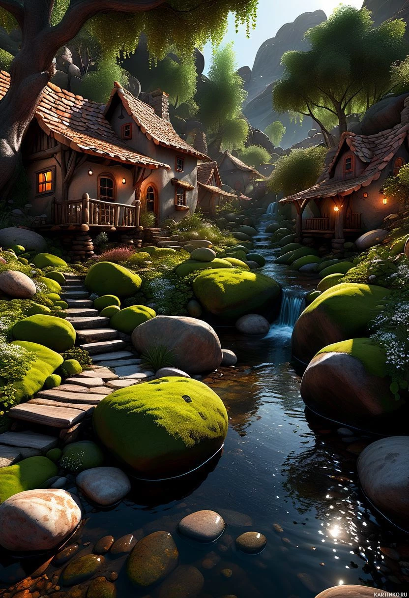 The image depicts a quaint, fantasy-style village nestled in a valley. There is a river meandering through the middle of the settlement with