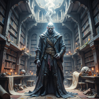 Картинка изображает персонажа, похожего на героя из фэнтезийного мира. У него бледное, угловатое лицо и короткие серебристые волосы. Он одет в тёмное одеяние с высоким воротником, украшенное сложными узорами, и накинул на плечо плащ. На поясе у него пояс с различными мешочками, что говорит о его готовности к приключениям или роли ученого. Он стоит в величественном помещении, напоминающем старинную библиотеку или кабинет, с высокими стеллажами, заполненными книгами и другими артефактами. В комнате много декоративных деталей: готические арки, большая люстра под потолком и свечи, которые создают атмосферу старины и загадочности. На стенах висят различные предметы, включая мечи и черепа, что указывает на связь с приключениями или изучением оккультизма. Освещение в комнате приглушённое, но лучи света пробиваются сквозь окна, драматично освещая сцену. Стиль картинки выразительный и кинематографичный, что позволяет предположить, что персонаж может быть из видеоигры или фэнтезийного фильма.