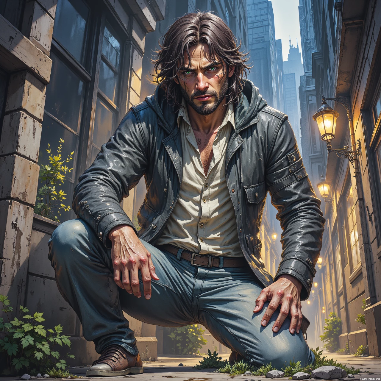 На картинке изображен мужчина, стилизованный под видеоигру или концепт-арт к ней. Он присел на улице, словно ищет укрытие. У него длинные темные волосы и кожаная куртка, придающая ему суровый вид. Выражение лица напряженное: взгляд направлен вперед, губы плотно сжаты, что создает впечатление серьезности. Задний план – старинный городской переулок с булыжной мостовой, фонарями и зданиями, покрытыми налетом времени.