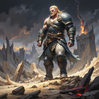 Картинка изображает персонажа в стиле фэнтези, похожего на воина. Он стоит на поле битвы, на заднем плане видны руины, создающие ощущение конфликта или его последствий. У персонажа крепкое телосложение, он одет в доспехи, включая шлем с крыльями, что может указывать на его мифическую или неземную природу. Его взгляд напряженный и сосредоточенный. В руке он держит оружие, которое, кажется, является частью его снаряжения. Стиль рисунка детализированный и драматичный, с темной цветовой гаммой, подчеркивающей интенсивность сцены.