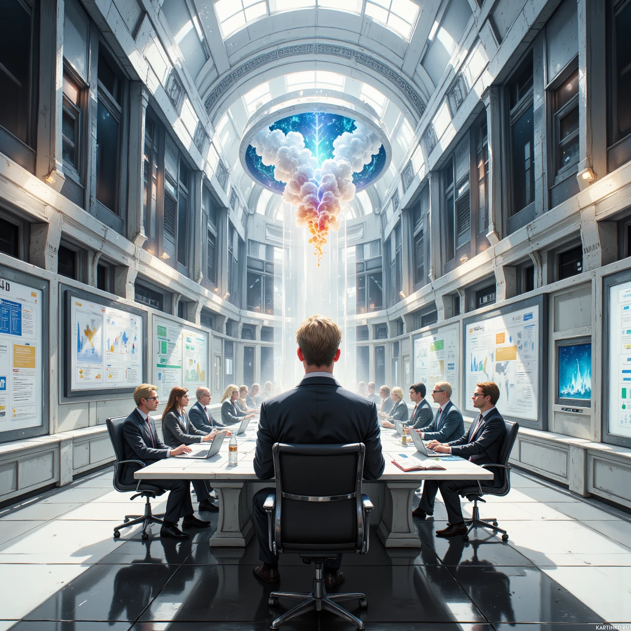 The image depicts an interior scene that could be a corporate office or meeting room. In the center, there is a man seated at a table surrounded by several other individuals who appear to be engaged in a discussion or a meeting. The man at the head of the table is facing away from the camera and looking towards his left. He is wearing a suit and tie, suggesting a formal or professional setting. The room is well-lit with natural light coming through what seems to be a high window that is out of frame. There are large screens displaying graphs or charts on the walls behind the seated individuals, implying that this might be a place where data analysis or financial discussions take place. The style of the image appears to be realistic with high attention to detail, possibly for promotional or artistic purposes.