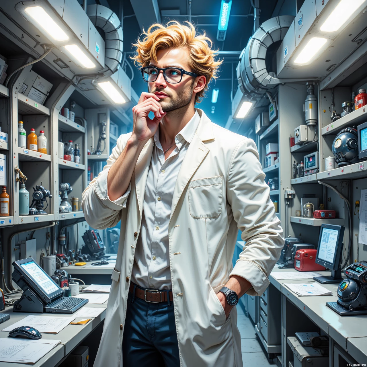 На картинке изображен мужчина, стоящий в помещении, напоминающем лабораторию или мастерскую. Он, кажется, погружен в раздумья, придерживая подбородок рукой и опираясь другой на бедро. На нем белый халат поверх рубашки, что позволяет предположить, что он ученый или техник. У него волосы средней длины и очки в темной оправе. Вокруг него множество оборудования и технологий, что указывает на современную высокотехнологичную базу. Видны мониторы с данными, панели управления с переключателями и датчиками, а также стеллажи, заполненные, возможно, образцами для испытаний или оборудованием. Освещение в комнате создает равномерное сияние на всех поверхностях, подчеркивая индустриальный характер сцены. Стиль фотографии тяготеет к реализму, с акцентом на детали и созданием ощущения глубины благодаря перспективе.