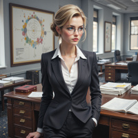 A young woman with blonde hair wearing glasses, a dark suit with light-colored top and no tie, leaning slightly forward on the edge of a desk. She is looking directly at the camera with a neutral expression. Behind her are dark wood bookshelves filled with books and papers, and framed charts or diagrams adorning the wall. The room has an institutional ambiance with its formal furnishings and scientific posters.