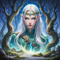 In the image, we see a character that appears to be an elf. The elf has long white hair and striking blue eyes. The elf is adorned with what looks like a crown or headpiece featuring a star or sun motif. They are dressed in traditional fantasy attire, including a tunic and a cape. The character's expression is serious, and they are looking directly at the viewer. The background of the image depicts a mystical forest scene. It includes tall trees with twisted trunks and branches, reminiscent of a magical or otherworldly landscape. The overall composition gives the impression of a character stepping into a fantastical realm.
