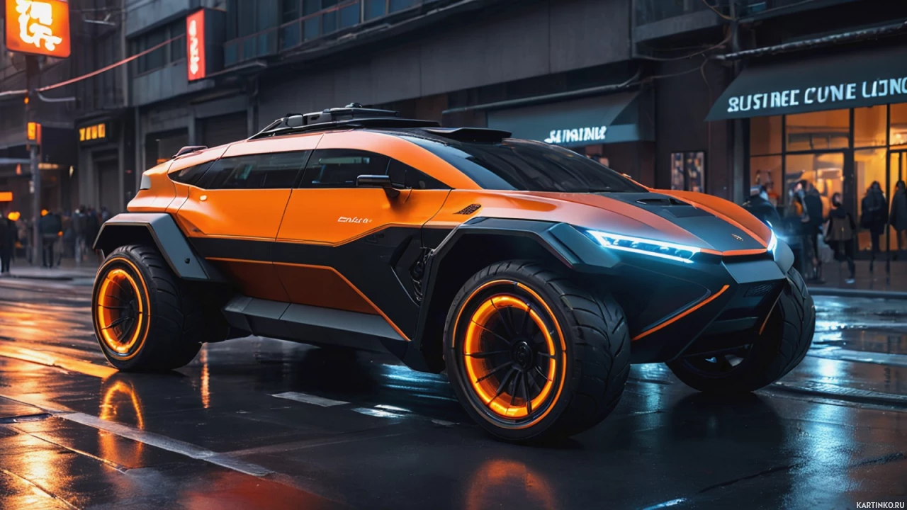 road vehicle, often referred to as an "off-roader" or "monster truck." It has an orange and black color scheme with distinctive treaded wheels designed for extreme
