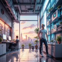 Картинка изображает футуристический пейзаж: двое мужчин находятся в передовой лаборатории на закате. На переднем плане стоит мужчина с руками на бедрах, в солнцезащитных очках и белой майке без рукавов. У него короткая стрижка, и кажется, он наблюдает или контролирует что-то. За ним, за столом с несколькими мониторами, показывающими различные данные и интерфейсы, сидит другой мужчина. В лаборатории – высокотехнологичное оборудование, включая панели управления и экраны на стенах. Большие окна открывают вид на городскую панораму на фоне заката, создавая футуристическую атмосферу.