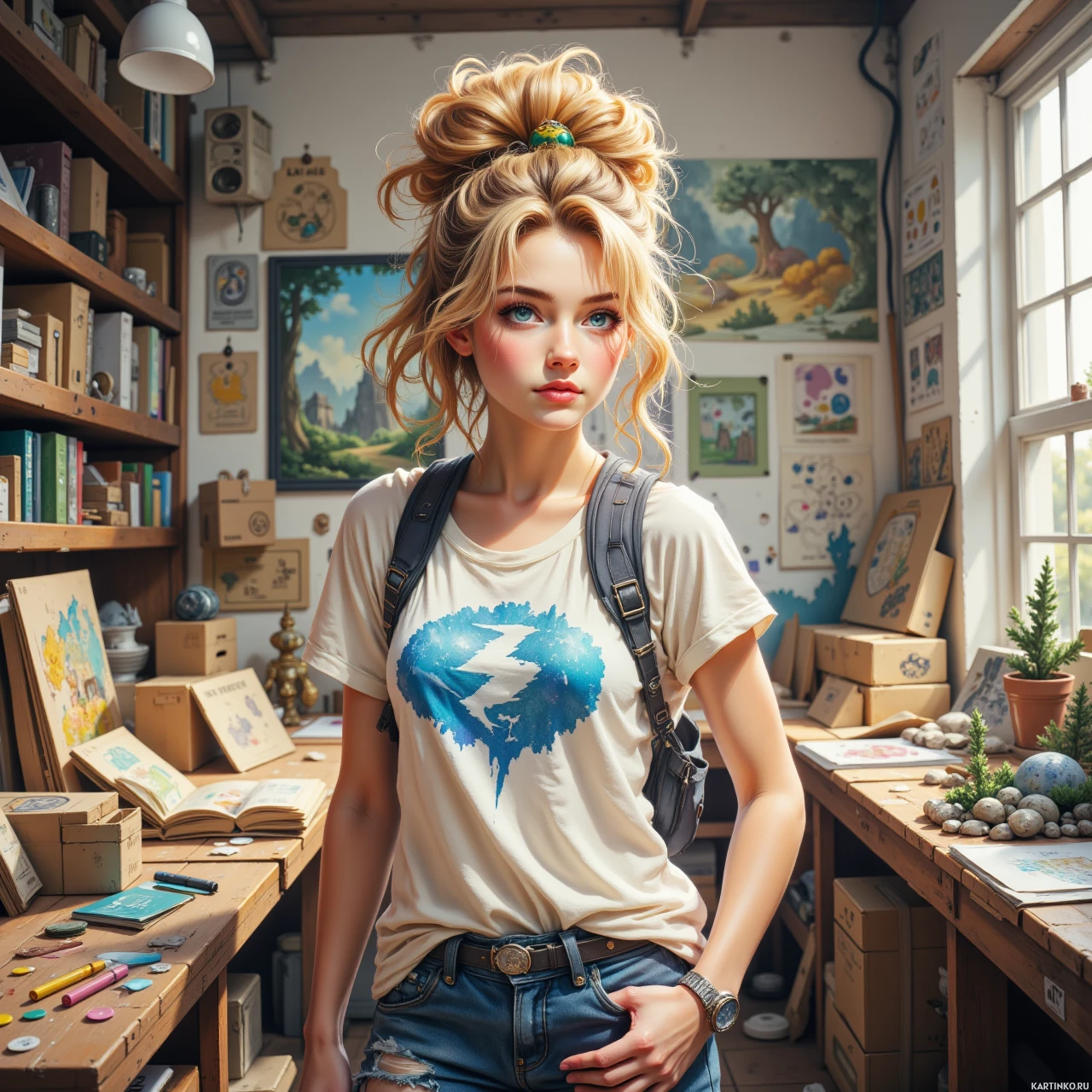 На этой картинке я вижу молодую женщину, стоящую в комнате, заставленной разными предметами и произведениями искусства. У неё светлые волосы, уложенные высоко с повязкой на затылке. На ней белая футболка с синим принтом и тёмно-синие джинсы. Через плечо перекинут чёрный рюкзак, что говорит о том, что она, возможно, что-то в нём носит. Комната вокруг неё довольно эклектична: полки, заполненные книгами разных размеров и цветов, создают яркий и несколько беспорядочный фон. На стенах также висят несколько картин или произведений искусства, которые добавляют общей творческой атмосфере пространства. Освещение в комнате естественное, возможно, от окон, которые не видны на этом снимке. В целом, впечатление такое, будто перед нами человек, связанный с творческой деятельностью или просто ценящий искусство и литературу, учитывая сочетание предметов и непринужденный, но модный наряд.