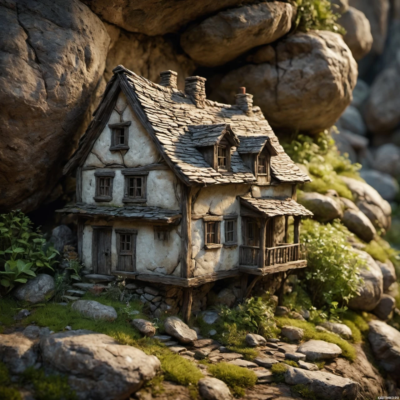 a natural setting, surrounded by large boulders that partially enclose it, giving the impression of being nestled within them like a snug fit. To the right of the house stands a prominent tree, adding to