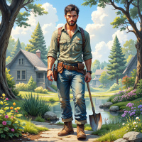 The image depicts a male character standing on a path that leads to a house with a garden in the background. He is wearing a backpack, a shirt with rolled-up sleeves, and blue jeans. He appears to be holding a small tool or device in his right hand, which could suggest he's engaged in some sort of outdoor work or activity. The style of the image suggests it might be illustrative artwork rather than a photograph, given its stylized quality and use of colors.