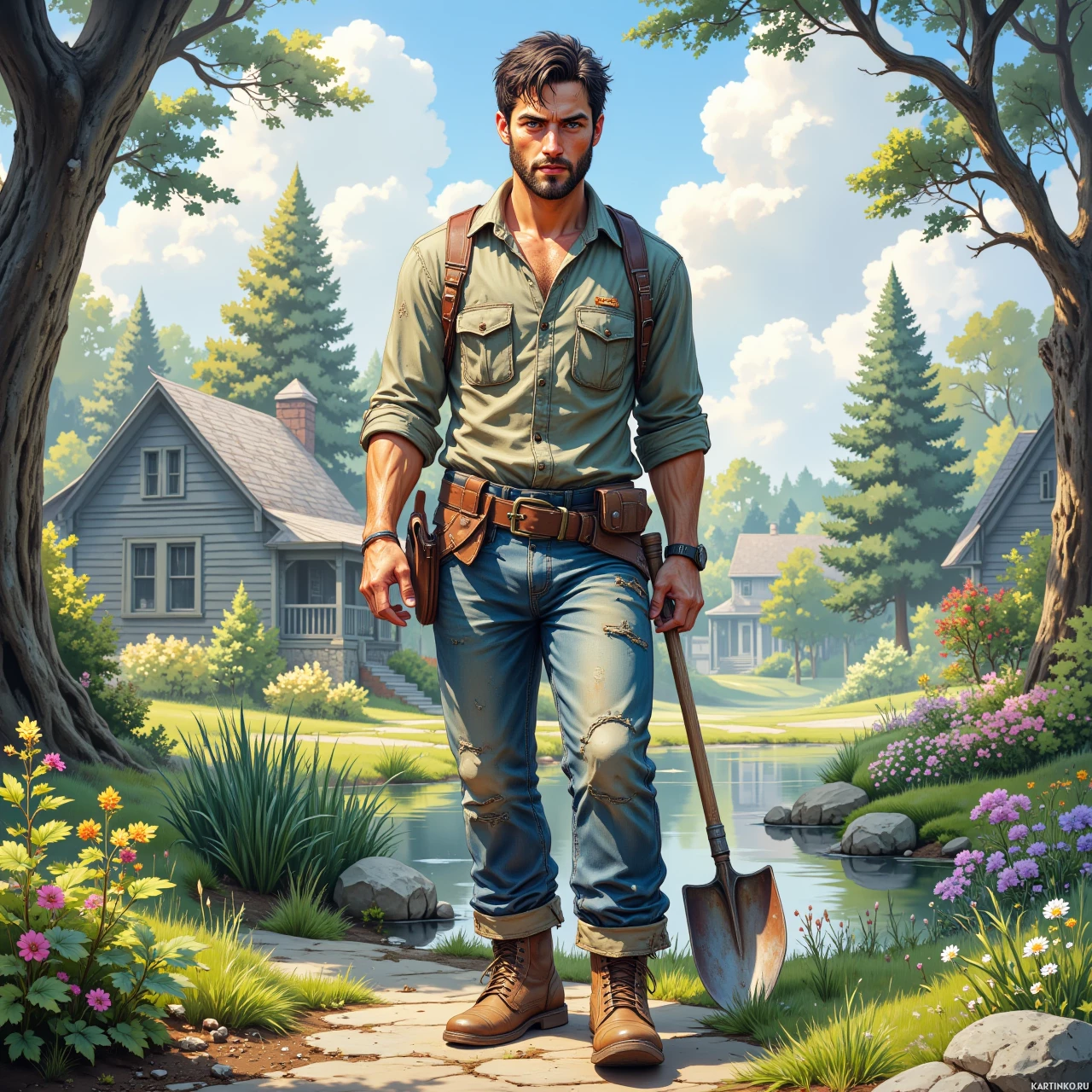 На картинке изображён мужчина, стоящий на тропинке, ведущей к дому с садом на заднем плане. На нём рюкзак, рубашка с подвёрнутыми рукавами и синие джинсы. Похоже, он держит в правой руке небольшой инструмент или устройство, что может говорить о каких-то работах или занятиях на свежем воздухе. Стиль картинки указывает на то, что это скорее иллюстративное искусство, чем фотография, учитывая её стилизацию и цветовую гамму.