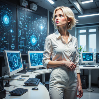 На картинке изображена женщина, стоящая в помещении, похожем на высокотехнологичный центр управления или операционный пункт. У неё короткие светлые волосы, она одета в белую рубашку с рукавами, подвёрнутыми до локтей, тёмные брюки и чёрные туфли. В комнате множество компьютерных мониторов, на которых отображаются сложные графики и схемы, что может указывать на анализ данных или наблюдение. На стенах – изображения, напоминающие технические чертежи.