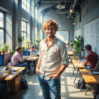 На картинке изображен человек, стоящий, судя по всему, в магазине электроники или в отделе с игровыми приставками, где множество плоских телевизоров и консолей. На нем белая футболка с красочным принтом, сочетающим оттенки розового, фиолетового, желтого, синего, зеленого и красного, напоминающего радугу или спектр. У него короткие волосы, и он смотрит прямо в камеру. Он одет в рваные джинсы и на нем виднеется пояс. Освещение в помещении искусственное, оно равномерно освещает товары и лицо человека.