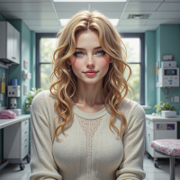 The image features a person with long blonde hair and fair skin. They are seated in an indoor setting that appears to be a medical office, characterized by the presence of a countertop with various items on it, some shelves with storage containers, and a window through which daylight is entering the room. The individual is wearing a light-colored top with a knit texture. Their expression is calm and they are looking directly at the camera.