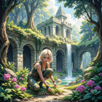 На картинке изображена юная девушка с золотистыми волосами в сказочном пейзаже. Кажется, она занята каким-то делом на земле; сложно сказать, что именно, но похоже, она взаимодействует с растениями или, возможно, что-то держит в руках. Вокруг – архитектурные руины со каменными арками, увитыми плющом, что создает ощущение природы, поглощающей рукотворные постройки. На заднем плане водопад, срывающейся с большой высоты, добавляющий умиротворяющую и таинственную атмосферу. Стиль картинки тяготеет к реализму с фантастическими элементами, создавая эффект погружения и волшебства.