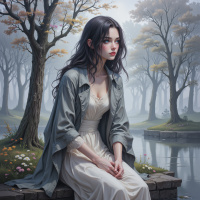 The image features a young woman with dark hair seated on what appears to be a stone wall or bridge overlooking a misty landscape that includes trees and a calm body of water. She is wearing a light-colored, possibly off-white dress with a lace top and a long skirt. Her posture suggests a contemplative mood. The background has a fairytale-like quality due to the soft mist and the dreamy atmosphere created by the colors and lighting.