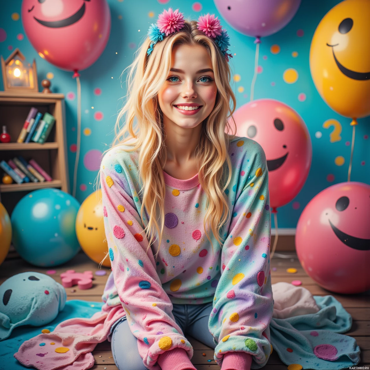 The image features a person sitting amidst an array of colorful balloons and confetti. The individual has long, wavy blonde hair and is wearing a pink sweater with a face pattern that includes smiling eyes, a nose, and a mouth. They have a joyful expression on their face and are looking directly at the camera. The background is adorned with balloons featuring different facial expressions such as frowning, neutral, and smiling faces, along with confetti in shades of pink, blue, and yellow. There are also books stacked neatly to the side.