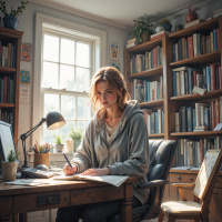 На картинке изображена молодая женщина, сидящая за столом в офисе, где полки заставлены книгами и различными предметами. На ней серый спортивный костюм, а волосы убраны вверх, с отдельными прядями на лбу. Её взгляд сосредоточен или задумчив, она смотрит на бумаги, с которыми работает, возможно, что-то пишет или читает.