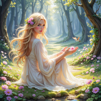 На картинке девушка с золотистыми волосами сидит на траве у опушки леса. На ней белое платье, ниспадающее до земли. К нам она стоит спиной, в руке держит цветок, которым, кажется, любуется. Вокруг нее лес густой и зеленый, с высокими деревьями на заднем плане. Через середину картинки протекает небольшой ручей, добавляя умиротворенную атмосферу этому месту.