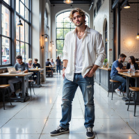 The image shows an interior space that appears to be a casual dining establishment, possibly a café or bistro. There are several individuals seated at tables engaged in conversation and enjoying their meals or drinks. On the right side of the frame, there is a man standing with his hands tucked into his pockets. He has a relaxed posture and is looking directly towards the camera. The man is wearing a white button-up shirt that is unbuttoned at the top, denim jeans, and sneakers. The lighting in the establishment seems warm, with pendant lights visible on the ceiling, providing a cozy ambiance. The walls are painted in a dark color, and there's a rustic brick wall accent visible behind the man. On the floor, some wooden planks can be seen, which might be part of the decorative theme of the establishment.