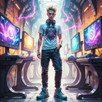 Это цифровая картинка, на которой изображен молодой человек, стоящий перед высокотехнологичным окружением. У него короткие волосы, на нем розово-черная футболка с принтом черепа, синие джинсы и белые кроссовки. Вокруг шеи у него наушники. На заднем плане несколько компьютерных мониторов, на которых отображаются яркие графические изображения, напоминающие энергетические узоры или цифровое искусство. Экраны светятся яркими цветами – оттенками фиолетового, розового, синего и желтого, создавая насыщенную футуристическую атмосферу. Действие происходит в полутемной комнате с элементами промышленного дизайна, такими как открытые трубы, кабели и электронное оборудование. Пол бетонный. Картина создает ощущение глубины, с источниками света, подсвечивающими сцену с обеих сторон и погружающими в виртуальный мир.