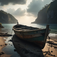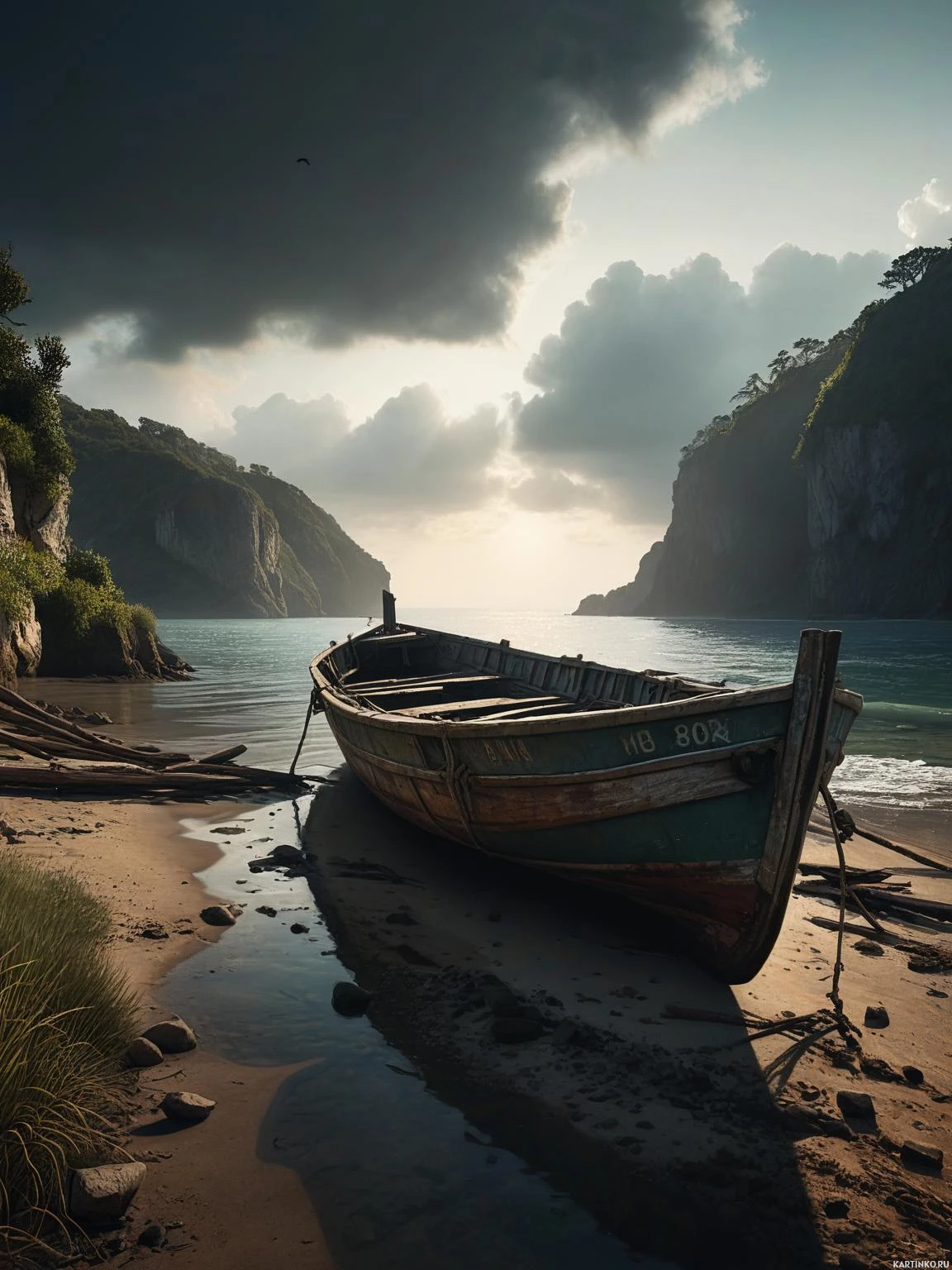 beach scene with a small wooden boat resting on the sandy shore near the water's edge. The sky above is dramatic, filled with clouds and rays of sunlight streaming through, suggesting either