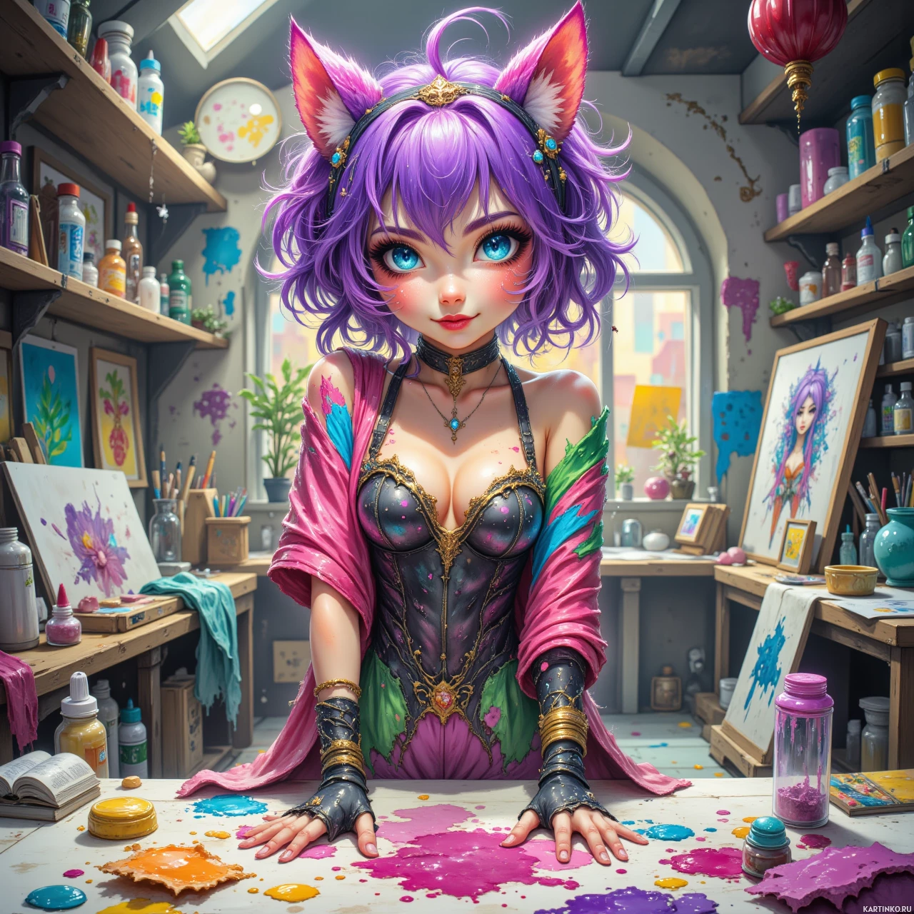 На картинке девочка с фиолетовыми волосами сидит за мольбертом, залитым разными оттенками краски. На ней платье, сочетающее в себе элементы фэнтези и готики, в розово-черных тонах. На заднем плане – окно, из которого виднеется вид на мир, где, кажется, идет дождь. Справа от неё множество картин, прислоненных к стене, каждая в своем стиле и с разной тематикой, что указывает на обстановку художественной мастерской. Общая атмосфера – творческий хаос, повсюду разбросаны художественные принадлежности, включая банки с красками и кисти на полу и мольберты.