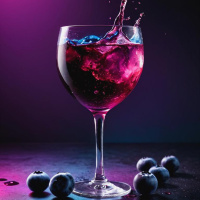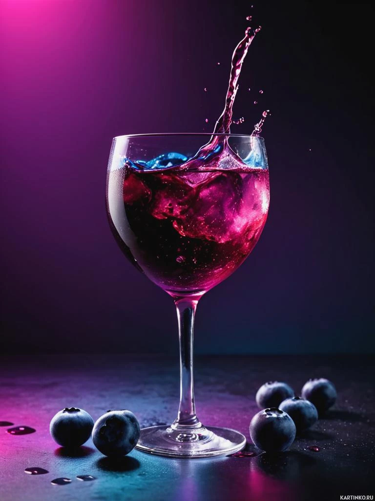 the vibrant colors of the drink and berries. There are no apples visible in this picture; it is focused on the wine and blueberries.