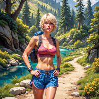 The image features a female character with blonde hair, wearing sportswear that includes a top and shorts, with a backpack on her shoulders. She is standing on a dirt path in a forested area, with lush greenery surrounding the trail. There are mountains visible in the background under a blue sky with clouds. The character appears to be a hiker or adventurer, given the attire and setting.