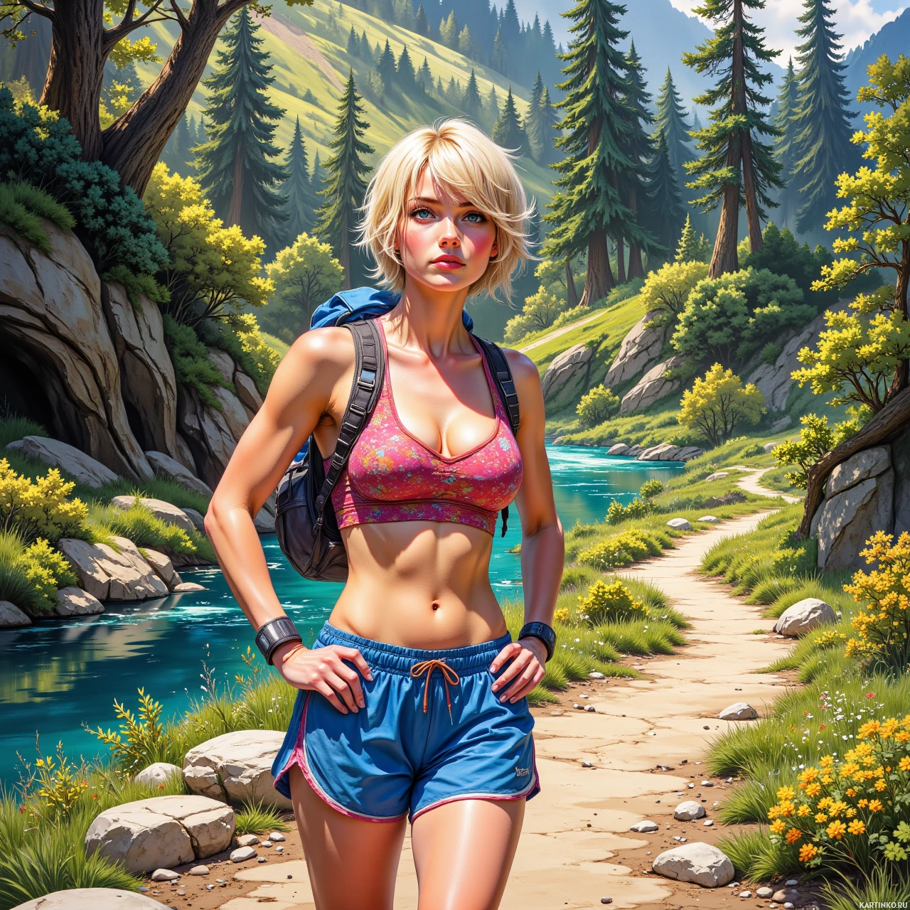 На картинке изображена девушка с светлыми волосами в спортивной одежде – топ и шорты, с рюкзаком за спиной. Она стоит на грунтовой тропинке в лесу, окружённая сочной зеленью. На заднем плане видны горы на фоне голубого неба с облаками. Судя по одежде и пейзажу, это туристка или любительница приключений.