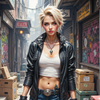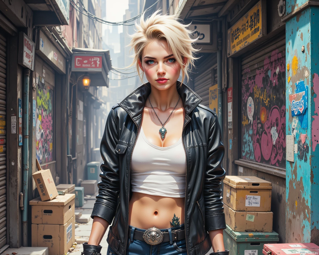 На этой картинке запечатлена молодая женщина, стоящая в городском переулке, который выглядит немного обветшалым – стены украшены граффити и плакатами. На ней черная кожаная куртка поверх белой майки, а волосы короткие, светлые, уложенные торчком. Выражение ее лица напряженное и сосредоточенное, она смотрит прямо в камеру. На правой руке виднеется браслет или какой-то аксессуар. Место действия создает ощущение сцены из фильма или фотосессии, передающей атмосферу сурового, урбанистического окружения.