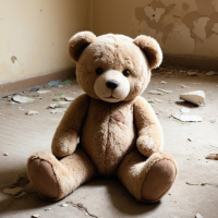 teddy bear sitting on what appears to be broken tiles or debris. The bear is positioned in the foreground and takes up