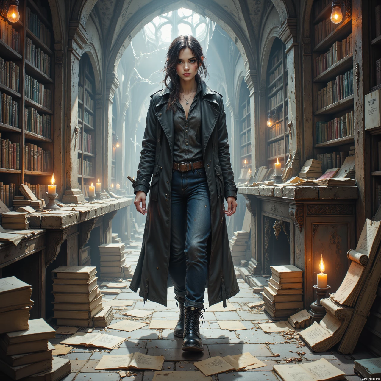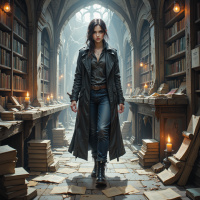 На картинке изображена молодая женщина с темными волосами в черном пальто и ботинках, стоящая посреди хаотичной сцены, где книги словно выпадают сверху. Она смотрит влево, взгляд слегка опущен вниз и направлен вправо. Выражение лица серьезное, кажется, она рассматривает что-то на полу возле ног. Место действия похоже на величественную библиотеку или кабинет, с высокими потолками и большими окнами, пропускающими естественный свет и создающими неземную атмосферу. Книги разного размера разбросаны по всей сцене, усиливая ощущение беспорядка.
