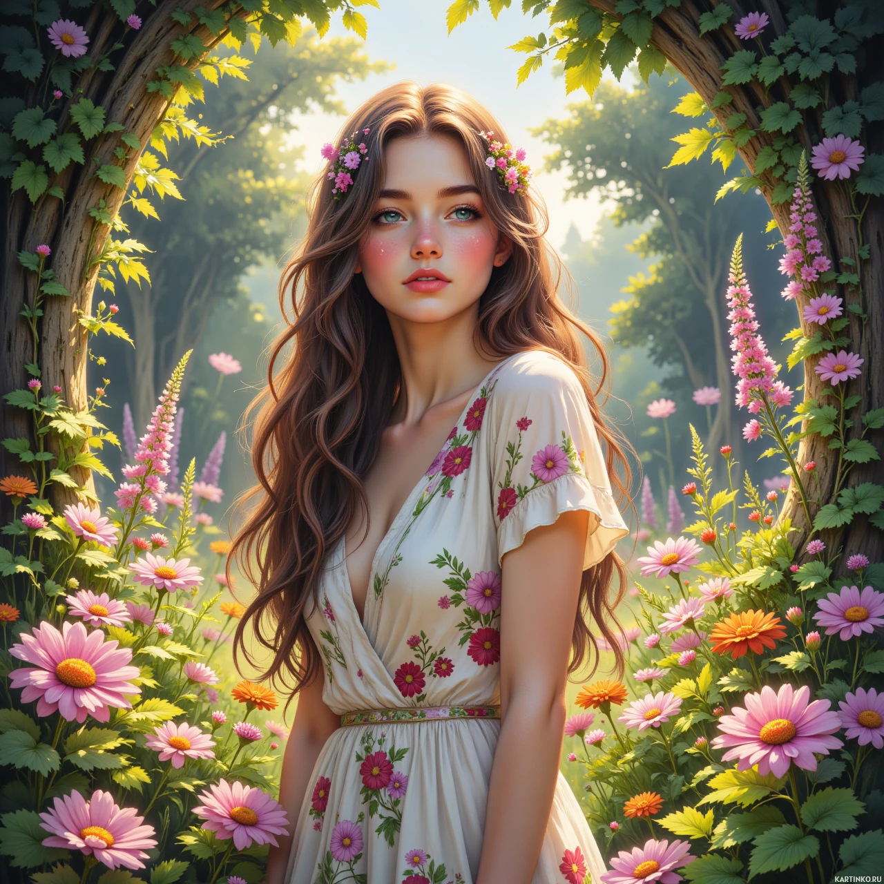 На картинке изображена женщина, стоящая на природе. У неё длинные каштановые волосы, а на ней платье с цветочным принтом. Вокруг неё розовые цветы, и она стоит перед лёгкой аркой, увитой лианами и листьями. Окружающая среда навевает сказочные или фантазийные мотивы благодаря пышной растительности и загадочному свечению, исходящему из-за её спины.