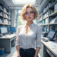 A young woman with short blonde hair and glasses standing in a well-lit room filled with computer screens, bookshelves containing medical files, and a clear view of a bright sky through large windows. She is wearing a light beige button-up shirt and black pants.