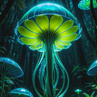 shades of blue and green, giving them an ethereal quality. One mushroom is more prominent than the others, appearing to be the centerpiece due to its size and