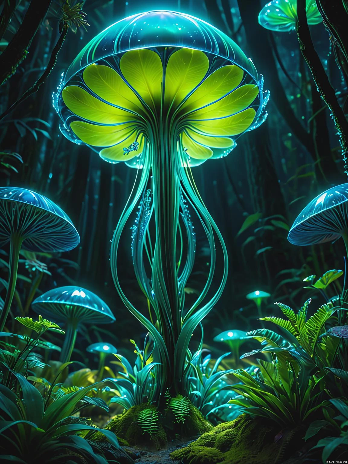vibrant colors. The background suggests a forest setting at night or dusk, with dark silhouettes that could represent trees or other vegetation, contributing to an enchanted, possibly