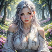 The image depicts a female character with white hair styled in two long braids on either side of her face, adorned with intricate silver and gold accessories. She has large, expressive eyes with a subtle hint of blue, accentuated by what appears to be red or pink lipstick. The character is wearing a medieval-style garment with lace detailing on the bodice and shoulders, complemented by a golden brooch at her neckline. She is seated in the foreground, looking directly at the viewer with a serene expression. Behind her are lush trees and flowers that hint at a peaceful garden or park setting. The overall style of the image suggests it might be from a video game or an animated series due to the character's stylized features and attire.