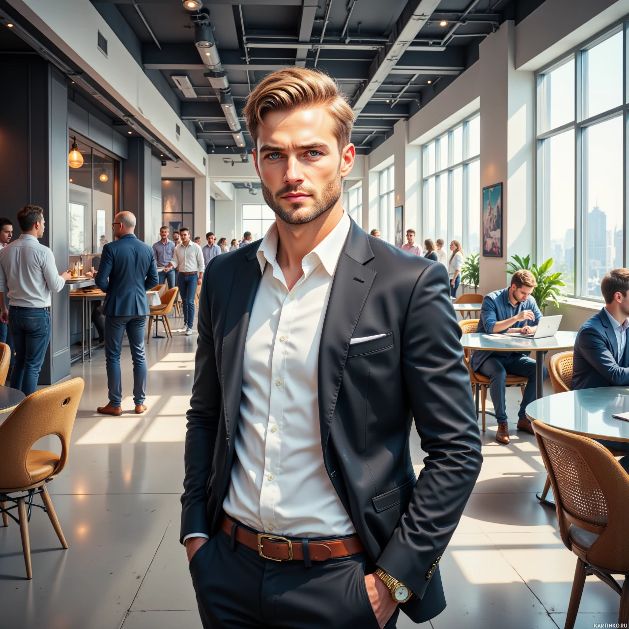 На картинке запечатлен мужчина, стоящий в помещении, похоже на современный офис. На нем строгий темный костюм, белая рубашка и коричневый ремень. Волосы у него уложены в современном стиле, что придает ему деловой вид. Офис оформлен в современном стиле: высокие потолки с открытыми вентиляционными трубами и светильники в индустриальном стиле. На заднем плане видны другие люди, которые, судя по всему, разговаривают или сосредоточены на работе. Мебель сочетает в себе дерево и металл, что подчеркивает современную эстетику пространства.