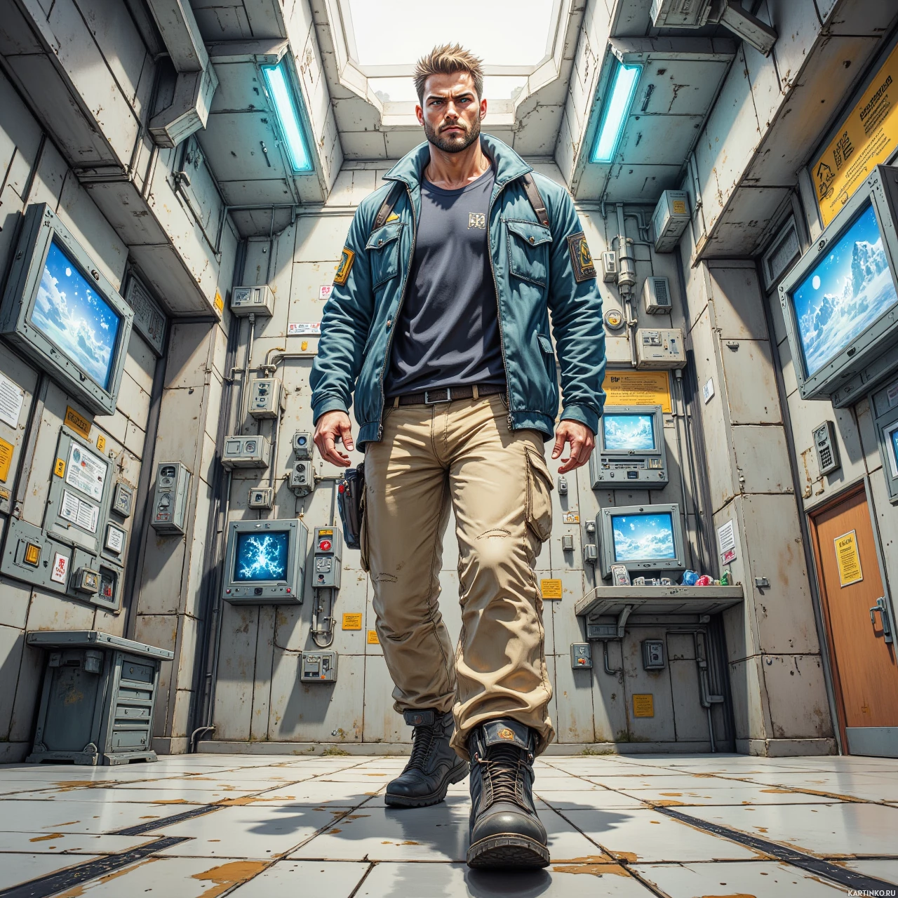 На картинке мужчина стоит в центре помещения, похожего на командный пункт космического корабля. На нём тёмно-синяя куртка, хаки и ботинки, а на талии – утилитарный пояс. Руки скрещены на груди, и он уверенно смотрит прямо в камеру. За его спиной – комната, заполненная электронным оборудованием с металлическим блеском. Стены увешаны панелями управления и экранами, на которых отображаются различные схемы и информация, связанная с работой космического корабля. Общая атмосфера картинки передаёт научно-фантастический антураж.