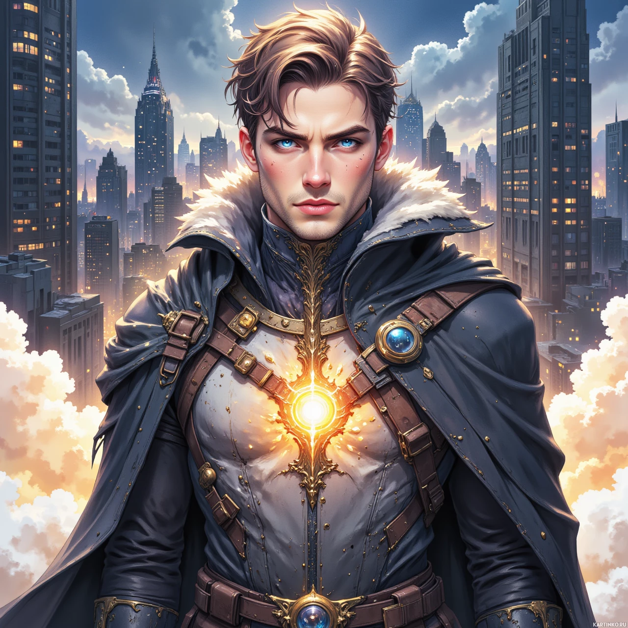 На картинке изображен персонаж, стоящий в футуристической городской среде. У него светлая кожа и на нем, похоже, доспехи с высоким воротником, украшенные сложными узорами и светящимися синими элементами. У него короткие волосы, а выражение лица серьезное – он смотрит прямо на зрителя. На заднем плане раскинулся город с небоскребами под пасмурным небом, освещенным огнями зданий и фонарей, что говорит о наступлении ночи или сумерек. Архитектура сочетает в себе очарование старины и современные технологии.