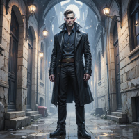In the image, a man stands in an alleyway under a canopy of trees and buildings. He is dressed in a long black coat with a high collar, and his hands are resting on his hips. The setting suggests a dark and moody atmosphere, possibly during the evening or at night, given the muted lighting and the presence of rain that has left puddles on the ground.