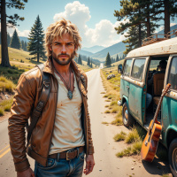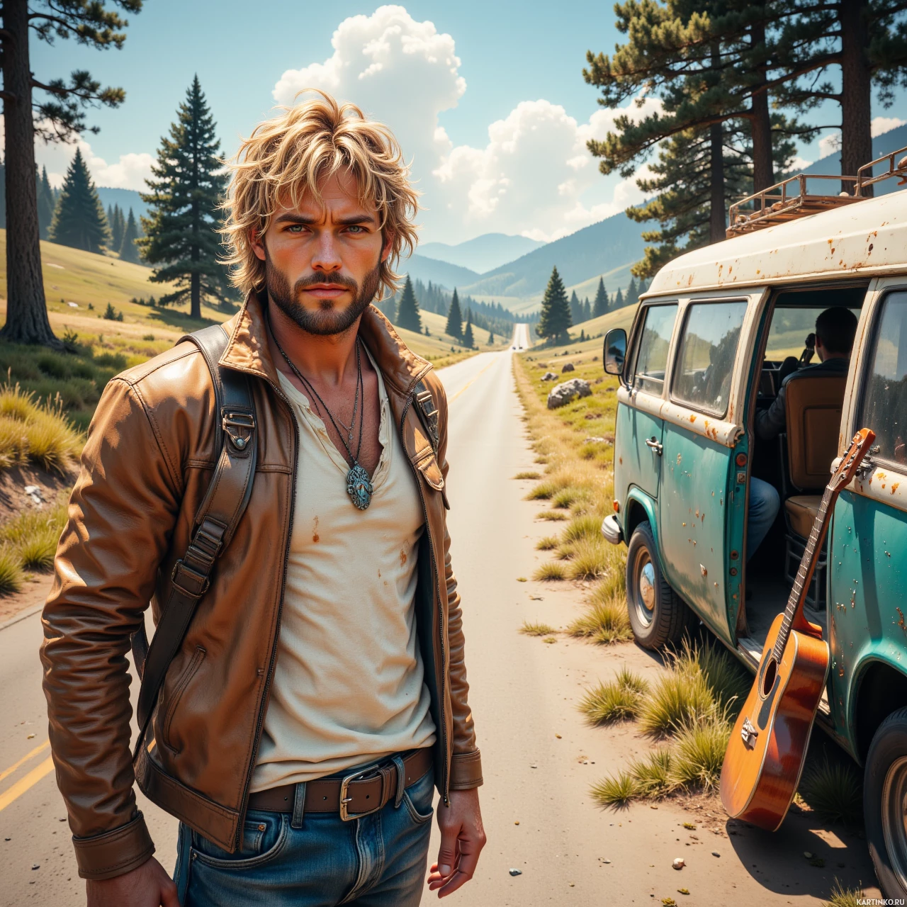 На картинке мужчина стоит у обочины грунтовой дороги, на заднем плане видны деревья и горы вдалеке. У него длинные волосы и кожаная куртка поверх футболки. Судя по всему, он держит гитарный чехол и перебирает струны гитары. Неподалеку припарковался фургон с открытой дверью. Вдоль дороги растут деревья, а на заднем плане – горы.