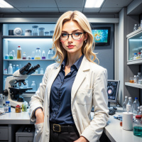 The image depicts a person posing in what appears to be a laboratory setting. The individual has blonde hair and is wearing glasses, which are a notable feature. They are dressed in professional attire including a white lab coat and a dark-colored blazer or jacket, suggesting a role such as that of a scientist or researcher. In the background, there are various pieces of laboratory equipment visible, including what seems to be test tubes and flasks on shelves, and a microscope, indicating an environment dedicated to scientific study. The overall setting gives the impression of a space designed for conducting experiments and analyzing samples.