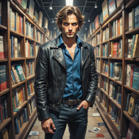 The image features a man standing in what appears to be a bookshelf setting. He has a rugged appearance, with short hair and a leather jacket, suggesting a tough or edgy character. His expression is serious, and he's looking directly at the camera. There are multiple books visible behind him on the shelves, which are of various sizes and colors, indicating a diverse collection. The lighting in the photo gives it a dramatic atmosphere.