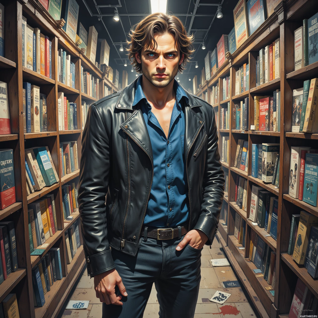 На картинке запечатлен мужчина, стоящий в обстановке, напоминающей книжный шкаф. У него немного небрежный вид: короткие волосы, кожаная куртка, что говорит о сильном и дерзком характере. Выражение лица серьезное, он смотрит прямо в камеру. На полках позади него видно множество книг разных размеров и цветов, создающих впечатление богатой и разнообразной коллекции. Освещение придает фотографии драматическую атмосферу.