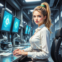 In the image, a young woman with blonde hair is seated at a desk in what appears to be a scientific or technological environment, possibly a control room or laboratory. She is dressed in a light-colored shirt and dark pants, and her hair is styled up into a bun with a scrunchie visible on her right side. She has a thoughtful expression and is looking slightly to the left of the viewer. The desk she's at has multiple computer monitors displaying various graphs and data, suggesting that she may be analyzing or monitoring information. There are also scientific equipment such as microscopes visible in the background, indicating an environment dedicated to research or analysis. The lighting is bright with a cool tone, emphasizing the technical nature of the scene.